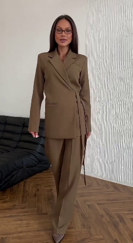 Головна » Магазин » Одяг » Жіночі костюми » Женский костюм (брюки классического кроя+приталенный пиджак на запах) мокко