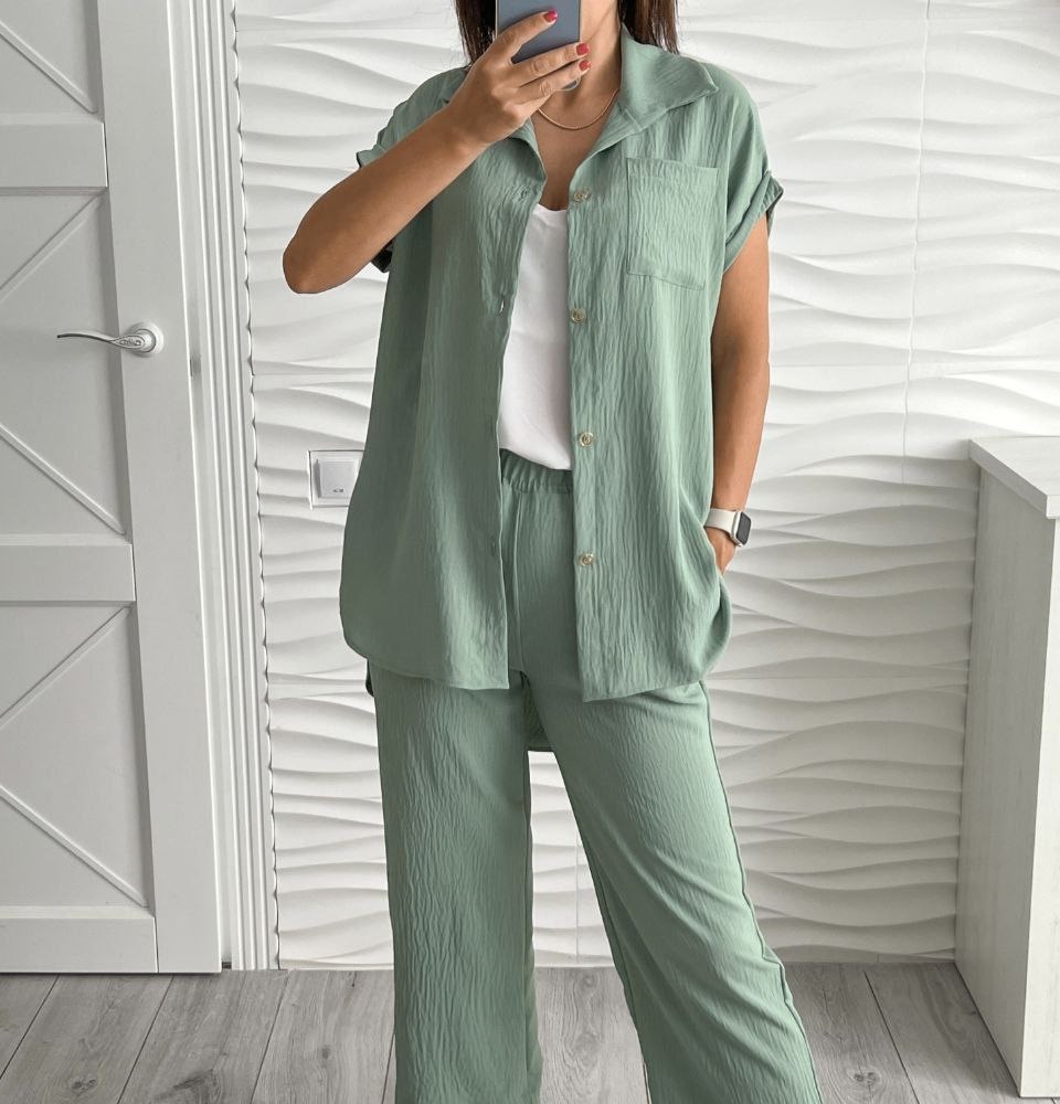 Женский костюм двойка рубашка с коротким рукавом и брюки оливка