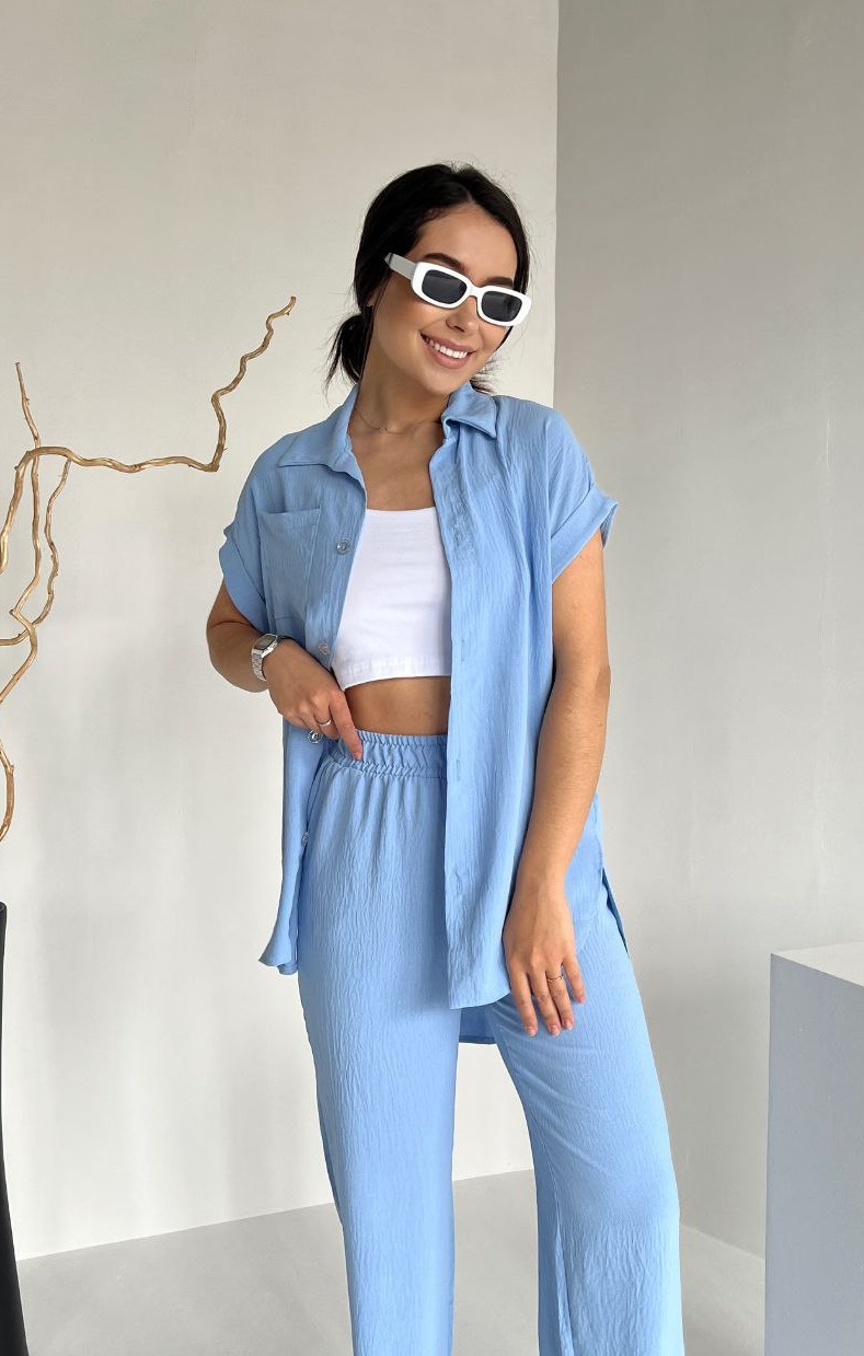Женский костюм двойка рубашка с коротким рукавом и брюки голубой