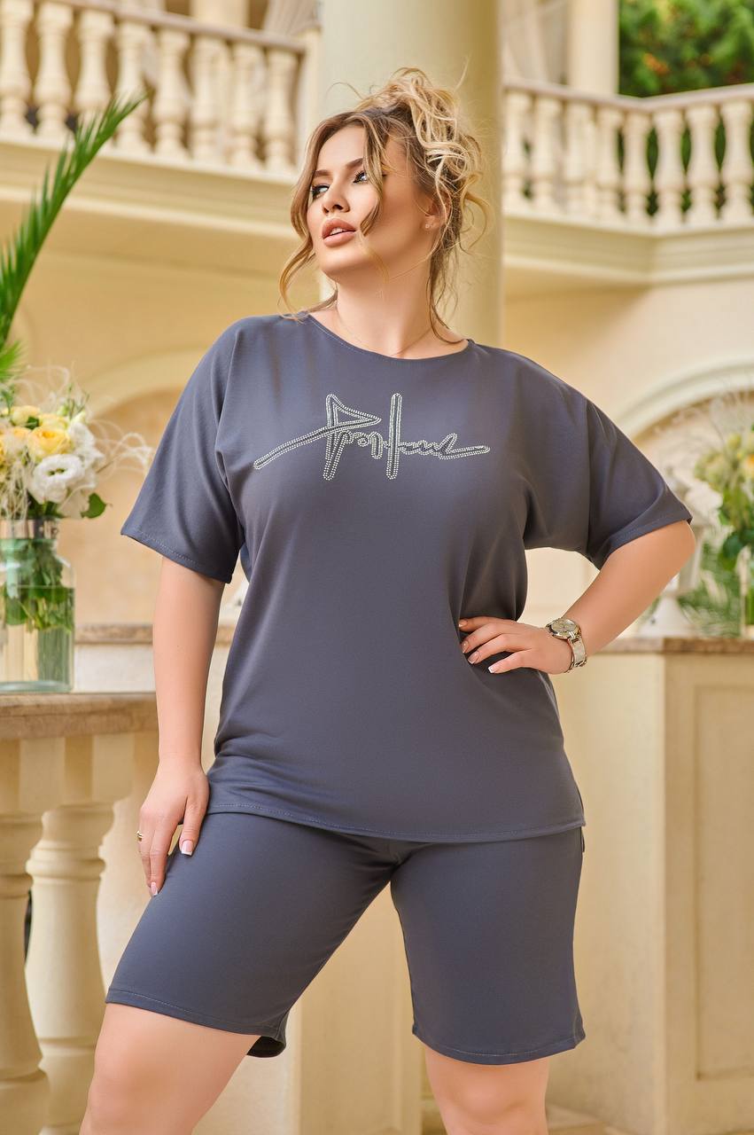 По бокам небольшие разрезы. Спереди украшена надписью из страз. Шорты высокая посадка на резинке, очень удобные, с карманами. Ткань хорошо тянется.