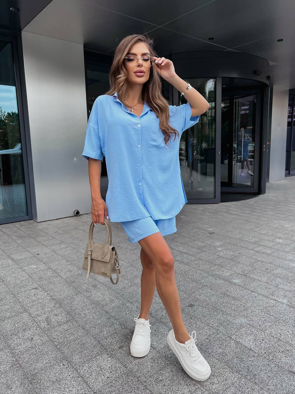 Женский костюм из жатки: рубашка на пуговицах с коротким рукавом и шорты голубой
