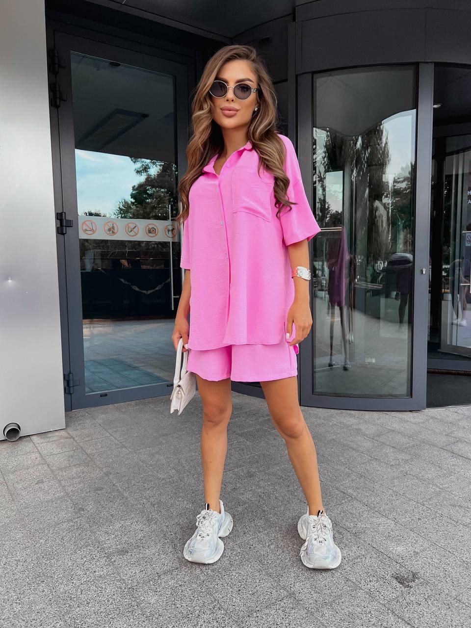 Женский костюм из жатки: рубашка на пуговицах с коротким рукавом и шорты барби