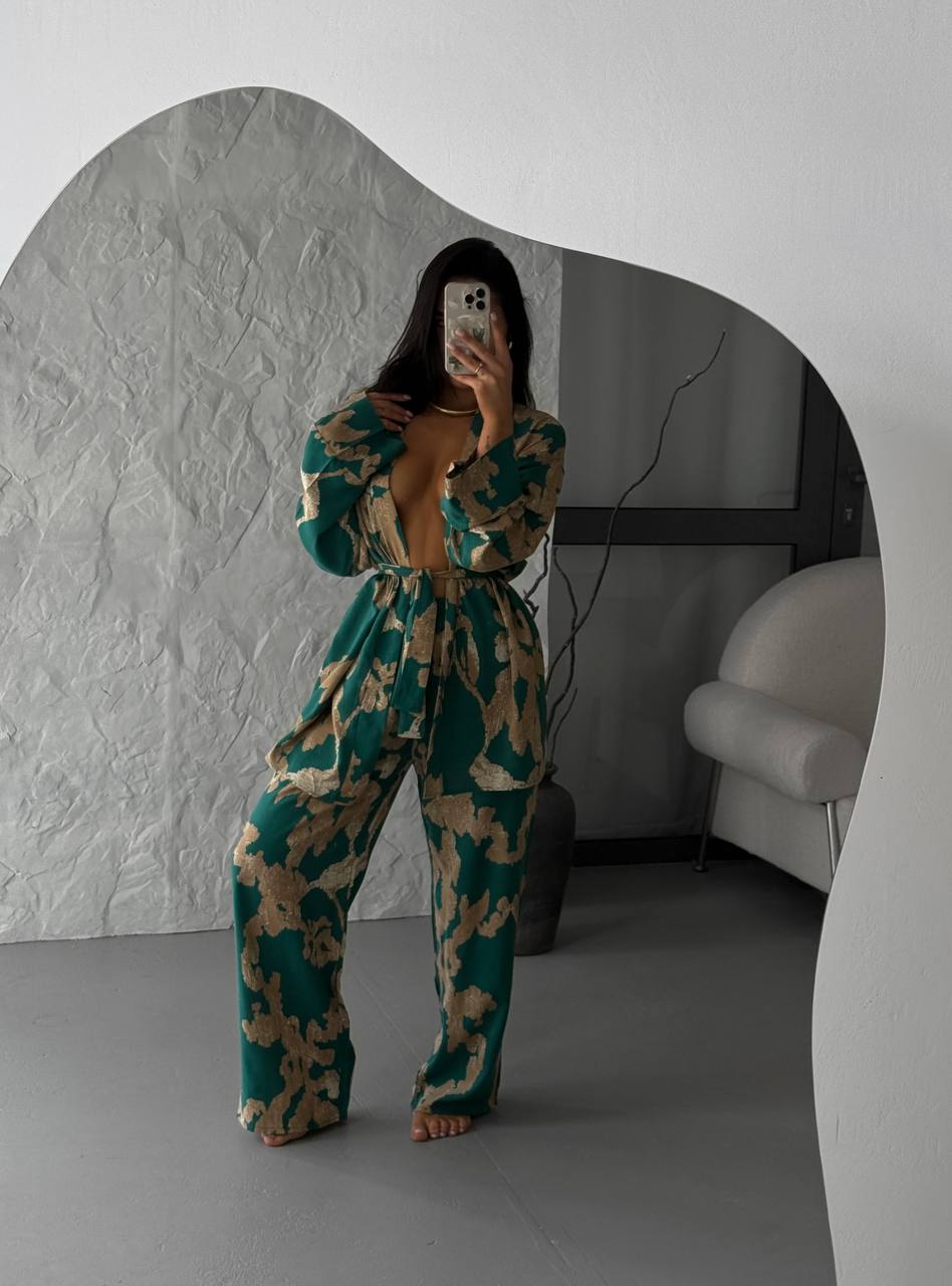 Женский костюм: рубашка-кимоно+свободные штаны морская волна