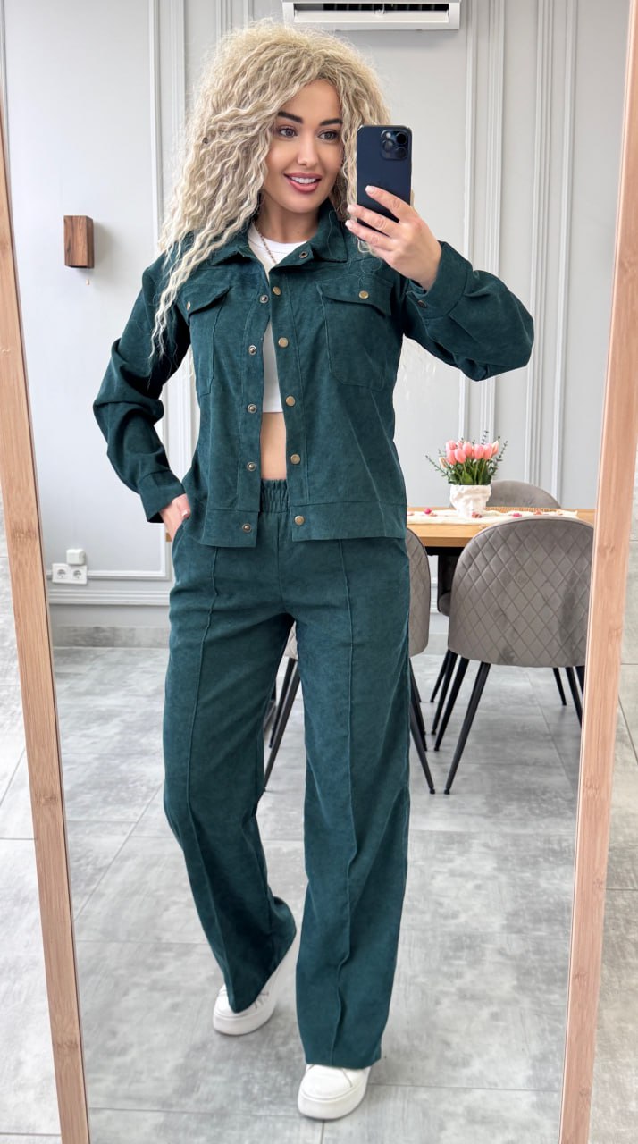 Головна » Магазин » Одяг » Жіночі костюми » Женский костюм: рубашка на кнопках+штаны (микровельвет) изумруд