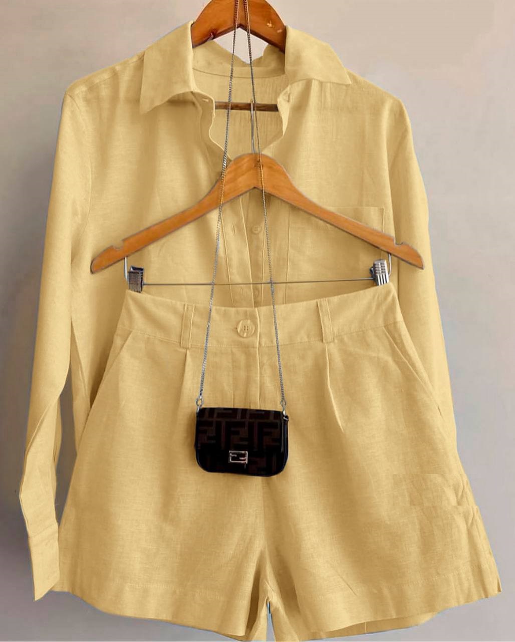 Головна » Магазин » Одяг » Жіночі костюми » Женский костюм: рубашка с воротником+шорты (лен) желтый