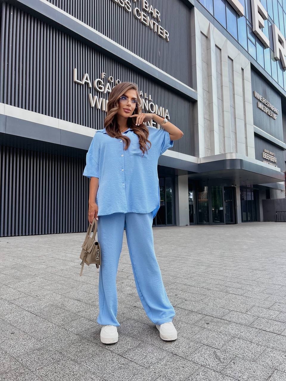 Женский легкий костюм: Рубашка на пуговицах с коротким рукавом+Брюки с карманами голубой