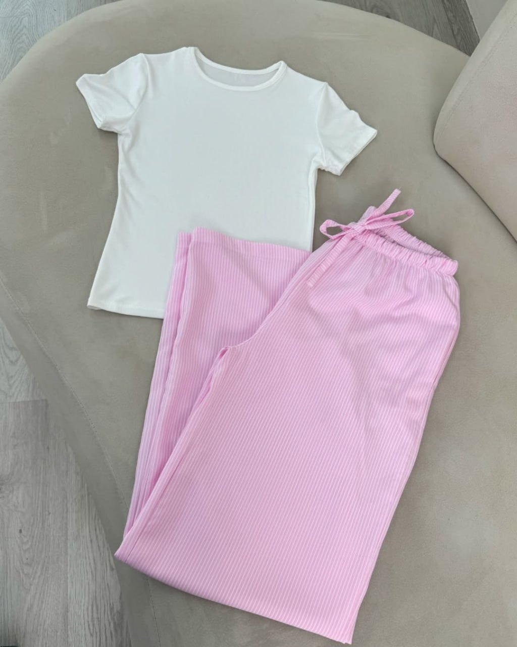 Мягкая футболка с коротким рукавом идеально сочетается с легкими брюками в тонкую полоску.