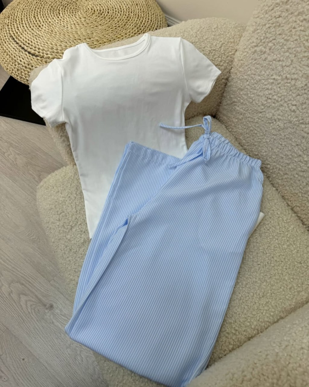 Мягкая футболка с коротким рукавом идеально сочетается с легкими брюками в тонкую полоску.
