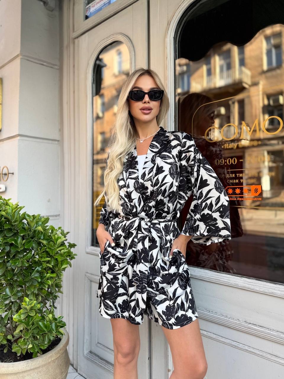 Головна » Магазин » Одяг » Жіночі костюми » Женский летний костюм из шелка: кимоно+шорты черный