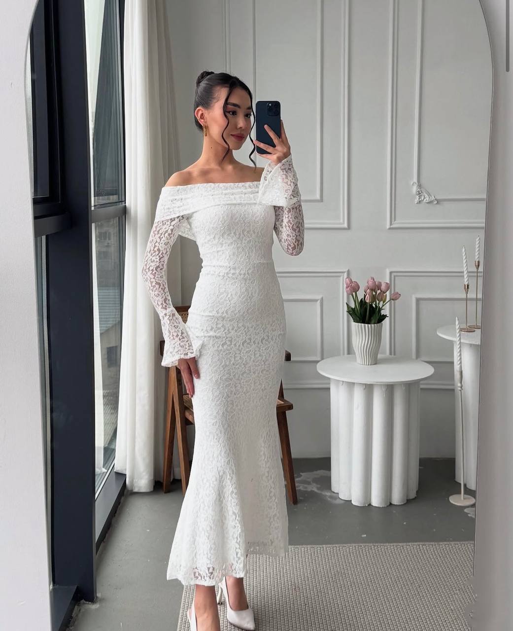 Женственное кружевное платье со спущенными плечами в длине макси молочный