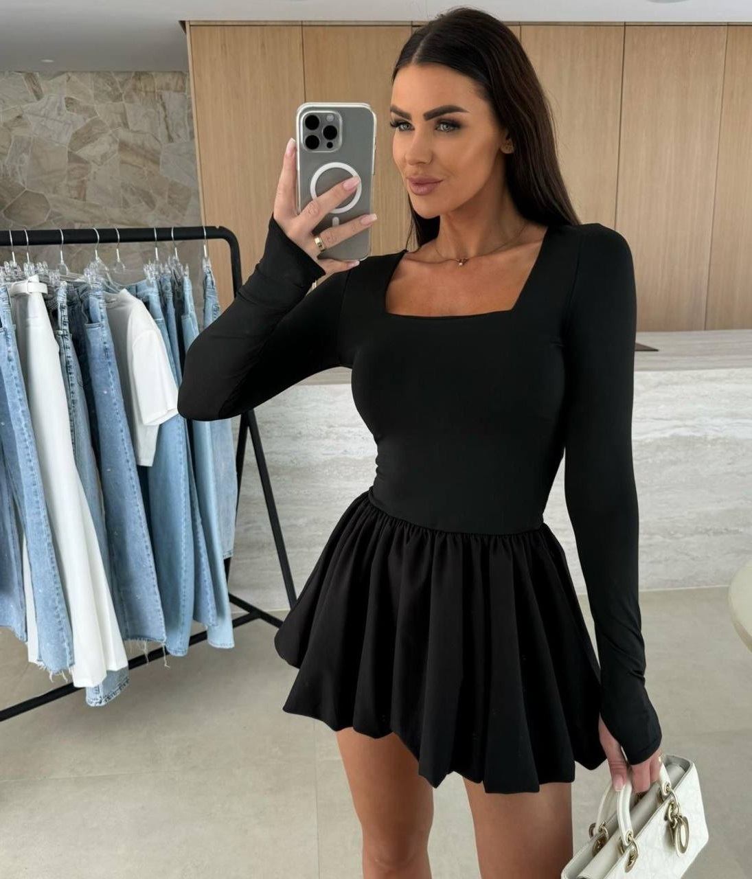 Невероятно женское мини-платье с вырезом в зоне декольте и объемной юбкой, подчеркивающей талию и ноги