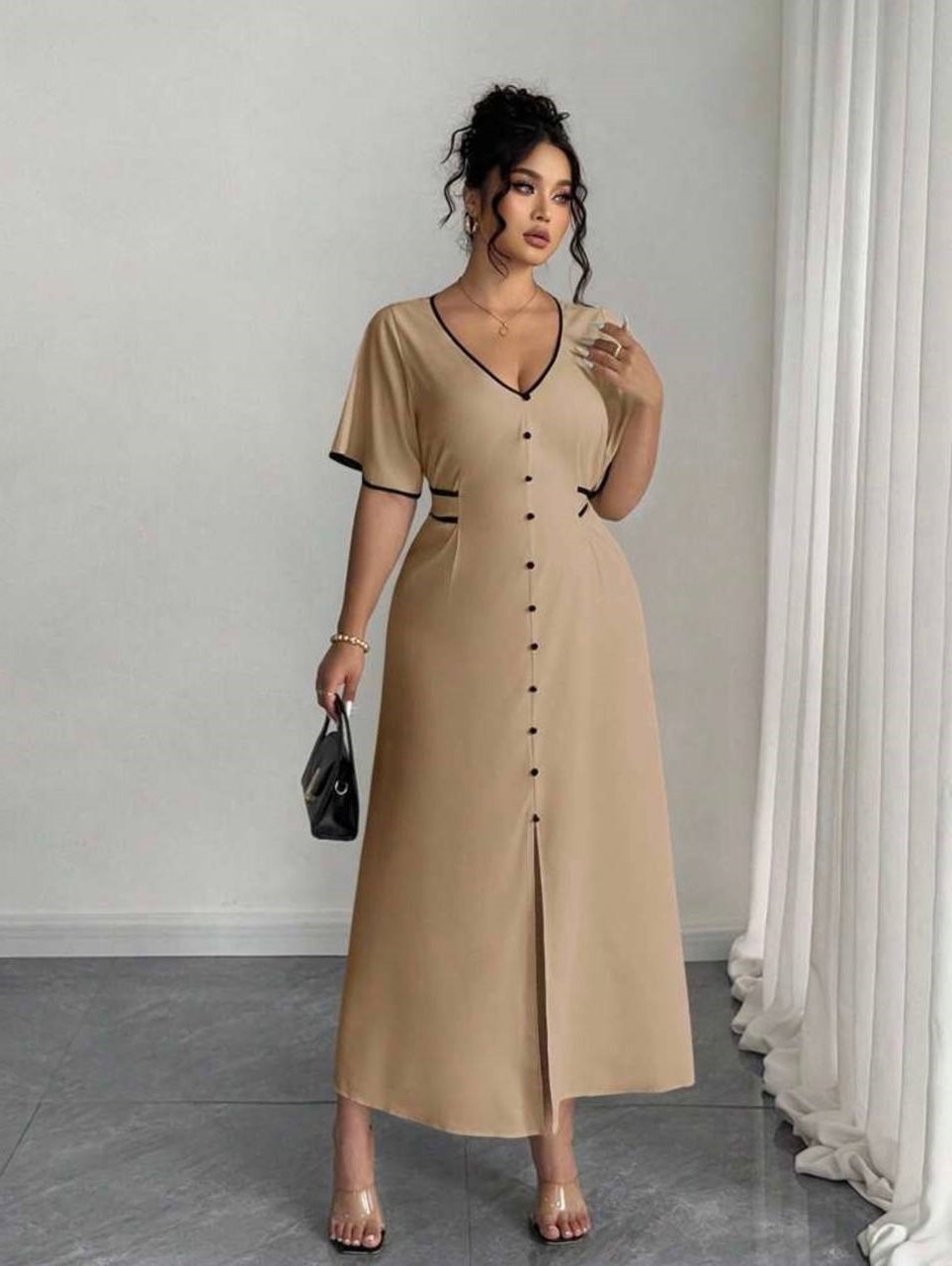 Стильное платье с вшивным пояском, украшенное спереди пуговицами и разрезом.