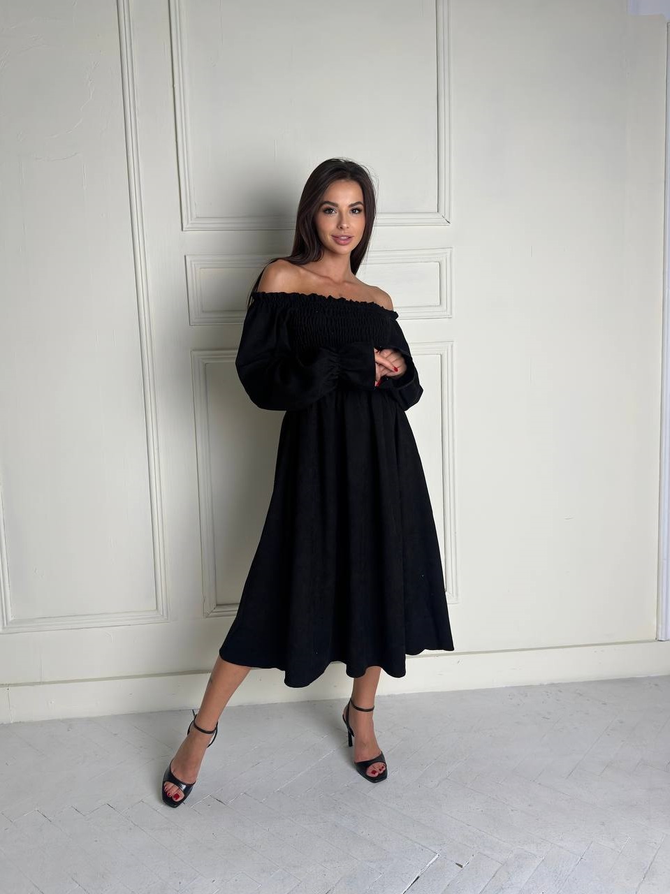 Женственное платье из вельвета с пышной юбкой+вверх на резинке черный
