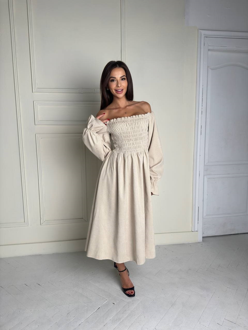 Женственное платье из вельвета с пышной юбкой+вверх на резинке молочный