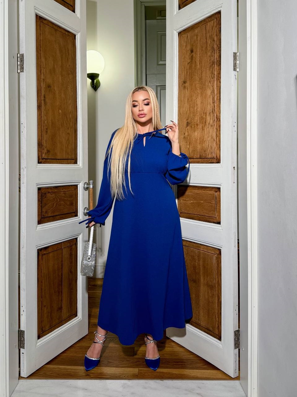 Платье фасона трапеция с объемными трендовыми рукавами.