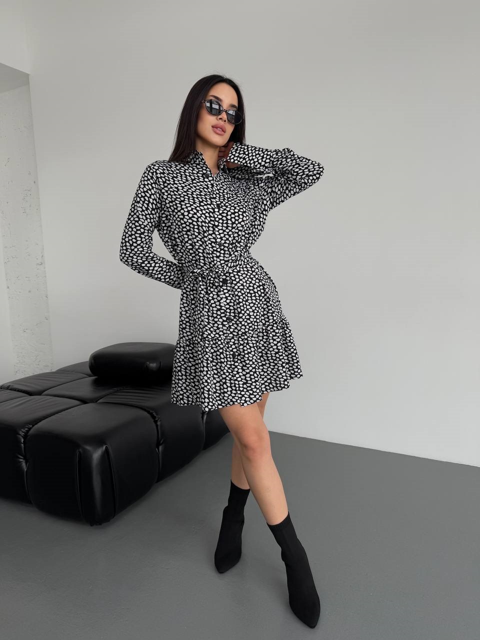 Головна » Магазин » Одяг » Сукня туніка сарафані » Женственное платье с длинными рукавами на завязках длиной мини+юбкой с воланом черно-белый