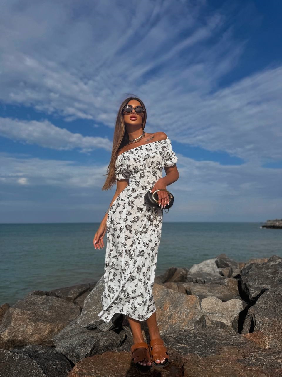 Женственное Платье с разрезом по ножке в цветочный принт белое основание с черным