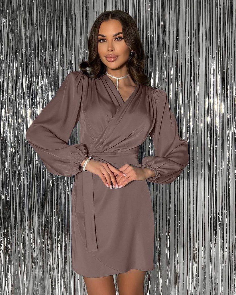 Женственное шелковое платье с расклешенной юбкой под пояс шоколад