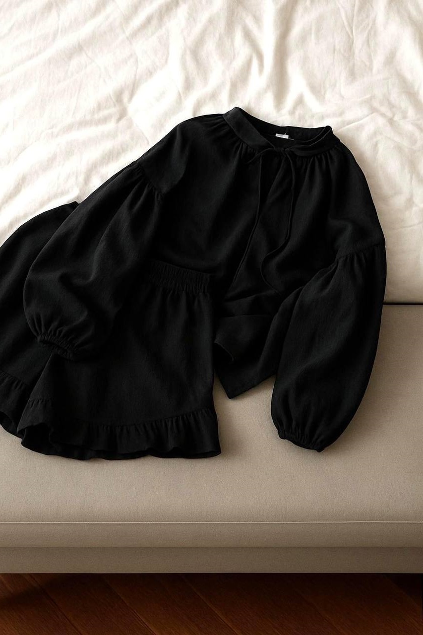 Женственный костюм (блуза с воротником стойкой на завязочках+шорты с оборочками) черный