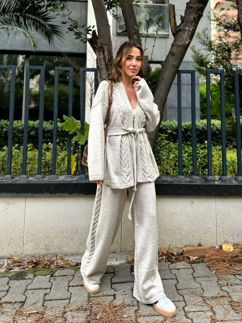 Женственный костюм с косами (кардиган на запах под пояс+брюки высокая посадка) серый