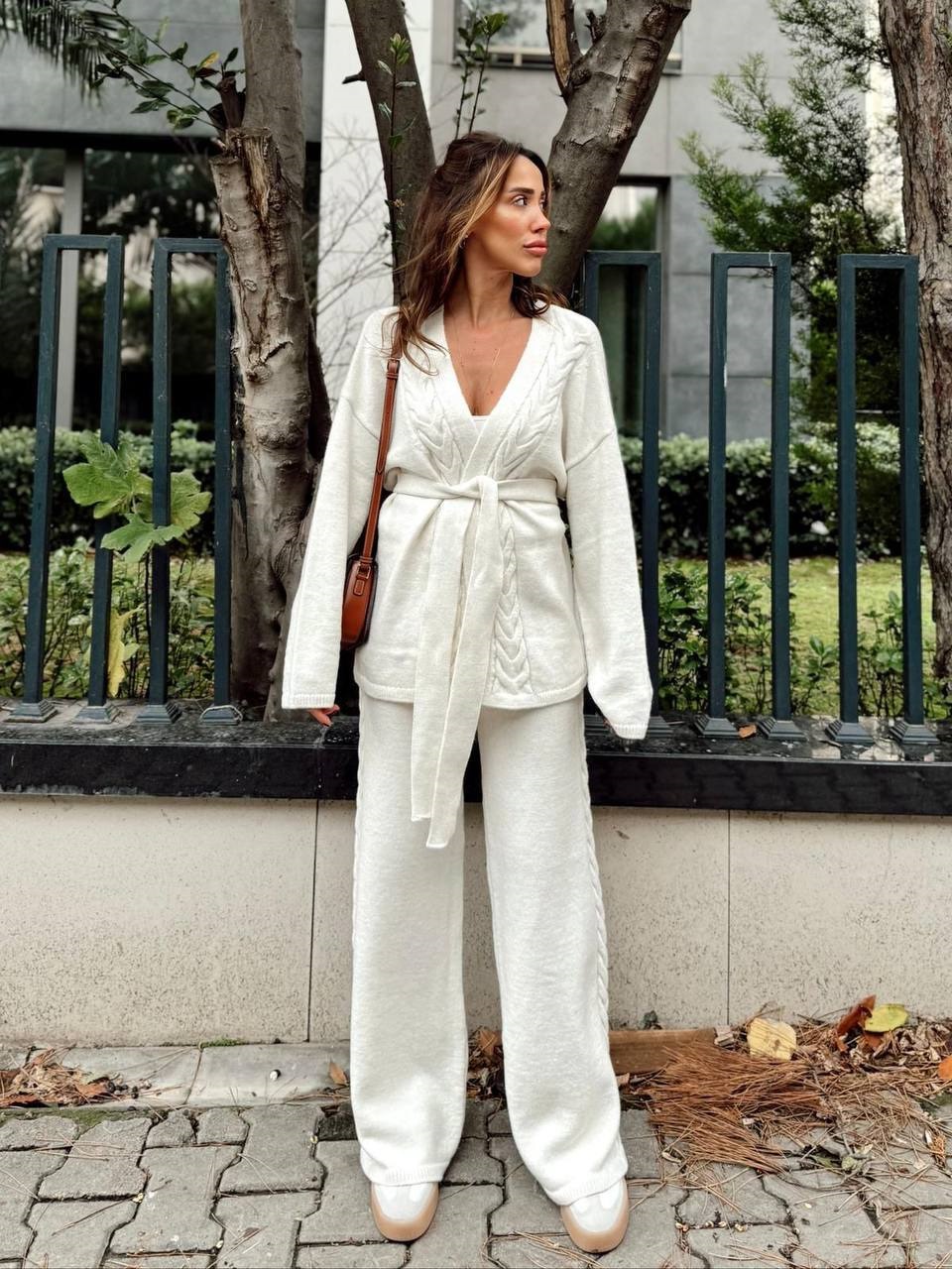 Элегантный костюм прямого кроя. Лаконичный кардиган на запах, в комплекте пояс, позволяющий регулировать объем и подчеркнуть талию.
