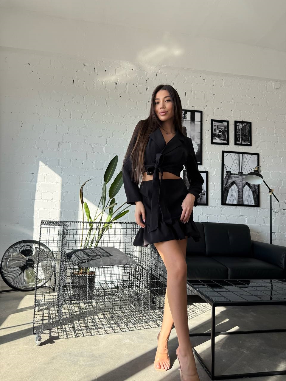 Женственный Костюм (укороченный пиджак с поясом+ юбка с воланчиком) черный
