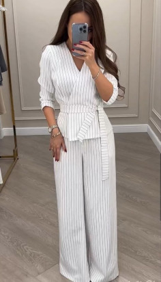Головна » Магазин » Одяг » Жіночі костюми » Женственный костюм (жакет на запах под пояс+брюки) принт полоска белый