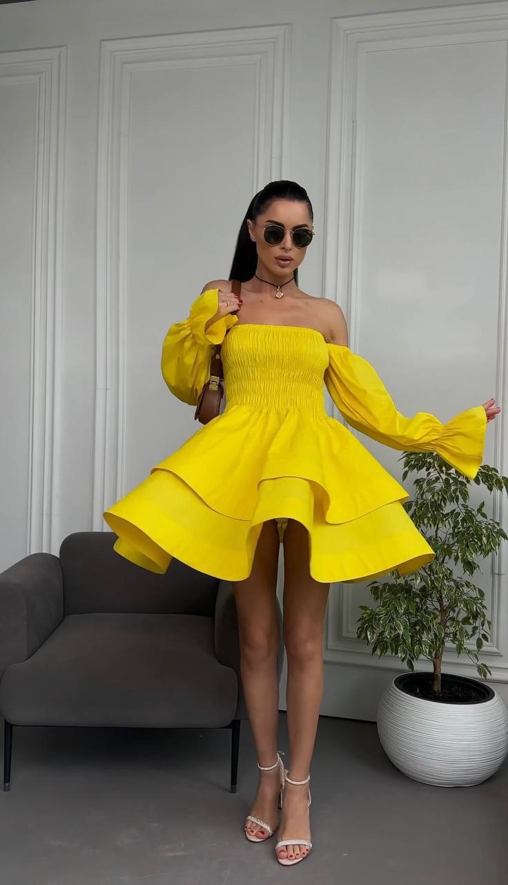 Женственный сарафан с расклешенной двойной юбкой+полочкой с настроченной резинкой желтый