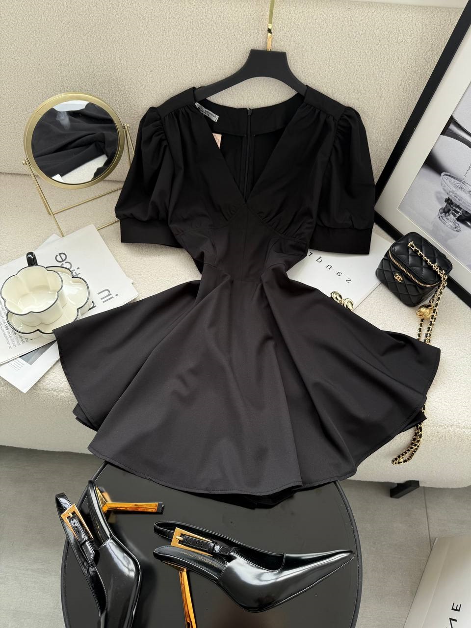 Будьте першим, хто залишив відгук “Женственный шелковистый комбинезон с рукавом-фонариком+расклешенной юбкой черный”“