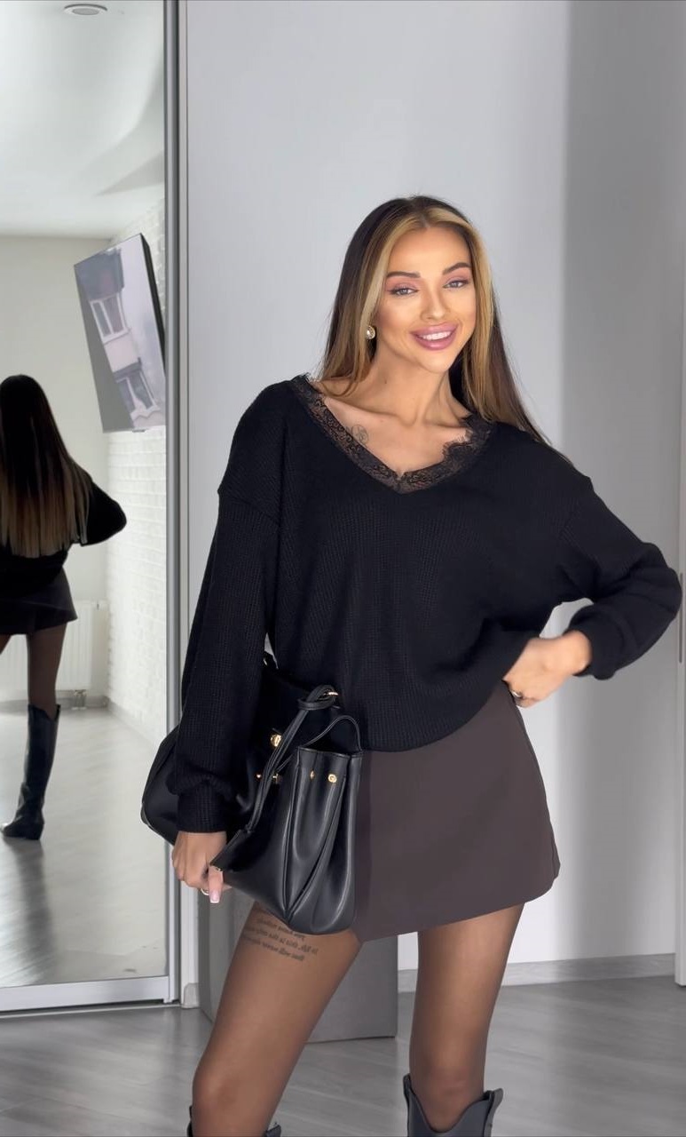 Женственный свитер с V-образной горловиной, оформленной кружевом, черный