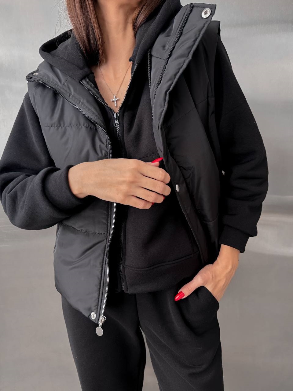Жилет из дорогой плащевки, на синтепоне; застегивается на молнию и кнопки; высокие ворот; цвет фурнитуры может отличаться от фото❗️